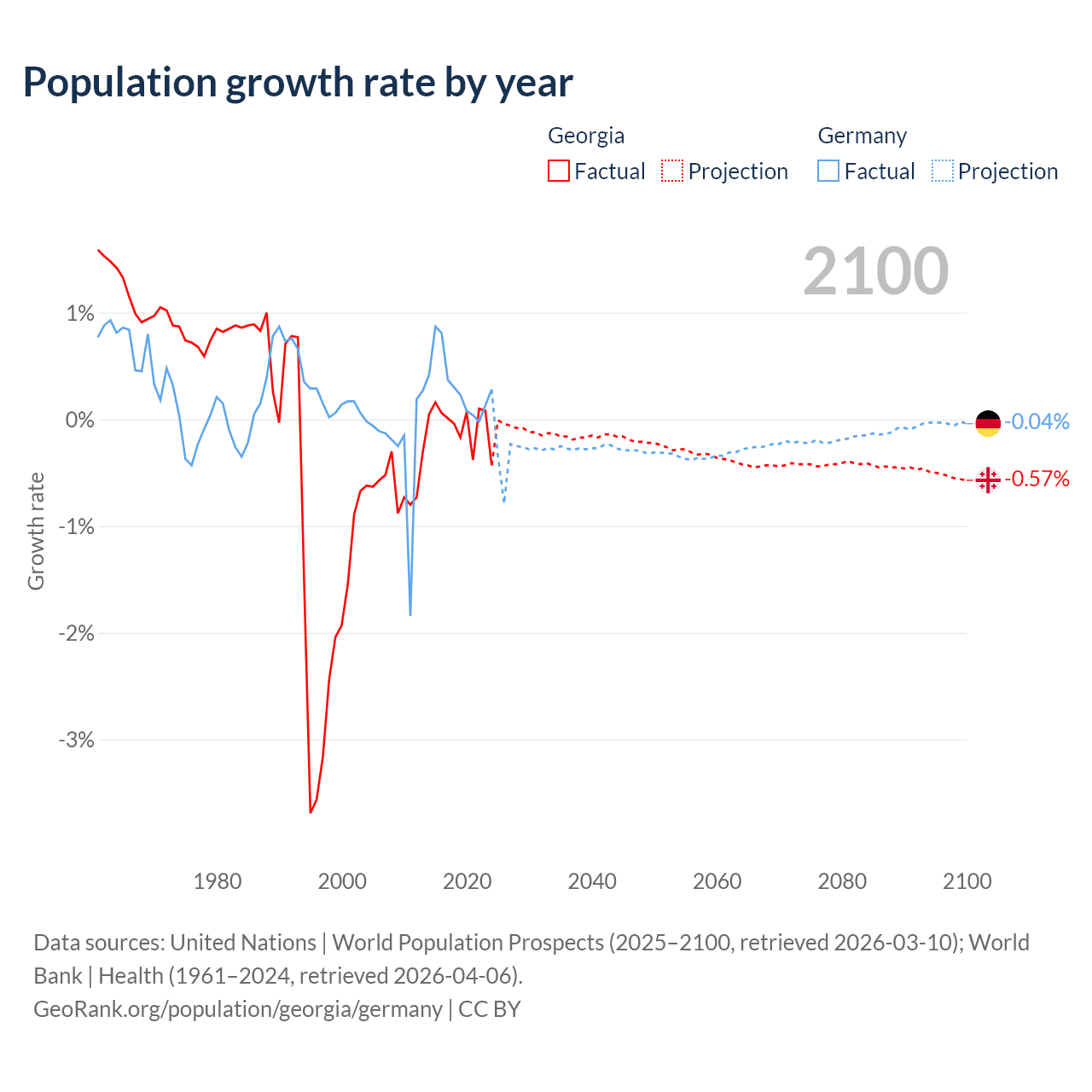 - For the last 10 years, Georgia has had an average growth rate of -0.04% per year vs +0.32% in Germany.