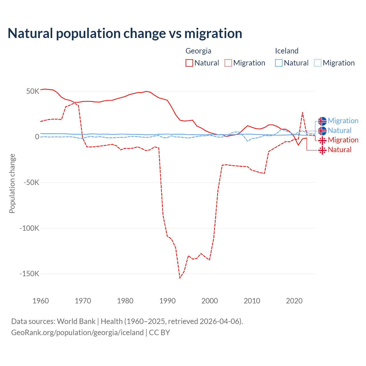 Over the last 10 years, 57.7% of the population change in Georgia is from natural causes (a gain of 47,646 people) and 42.3% is from migration (a loss of 34,907 people). In Iceland 30.7% is from natural causes (a gain of 20,128 people) and 69.3% is from migration (a gain of 45,356 people).