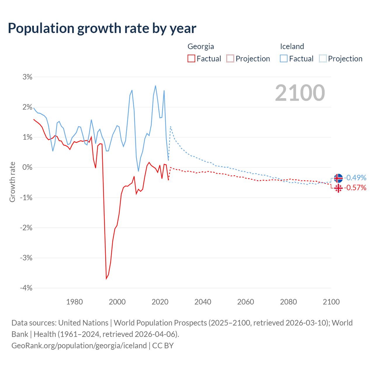 - For the last 10 years, Georgia has had an average growth rate of -0.04% per year vs +1.63% in Iceland.