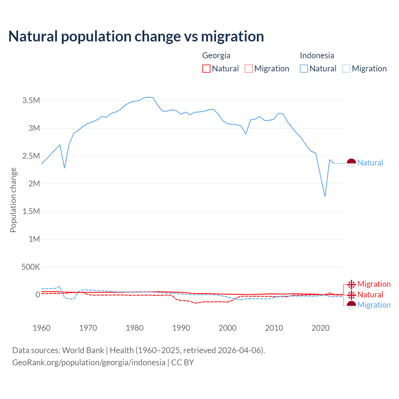 Over the last 10 years, 57.7% of the population change in Georgia is from natural causes (a gain of 47,646 people) and 42.3% is from migration (a loss of 34,907 people). In Indonesia 98.9% is from natural causes (a gain of 25,242,860 people) and 1.1% is from migration (a loss of 280,258 people).