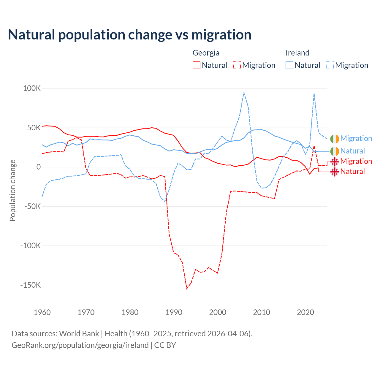 Over the last 10 years, 57.7% of the population change in Georgia is from natural causes (a gain of 47,646 people) and 42.3% is from migration (a loss of 34,907 people). In Ireland 48.2% is from natural causes (a gain of 284,644 people) and 51.8% is from migration (a gain of 305,297 people).