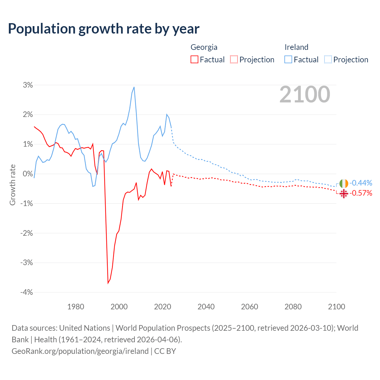 - For the last 10 years, Georgia has had an average growth rate of -0.04% per year vs +1.41% in Ireland.
