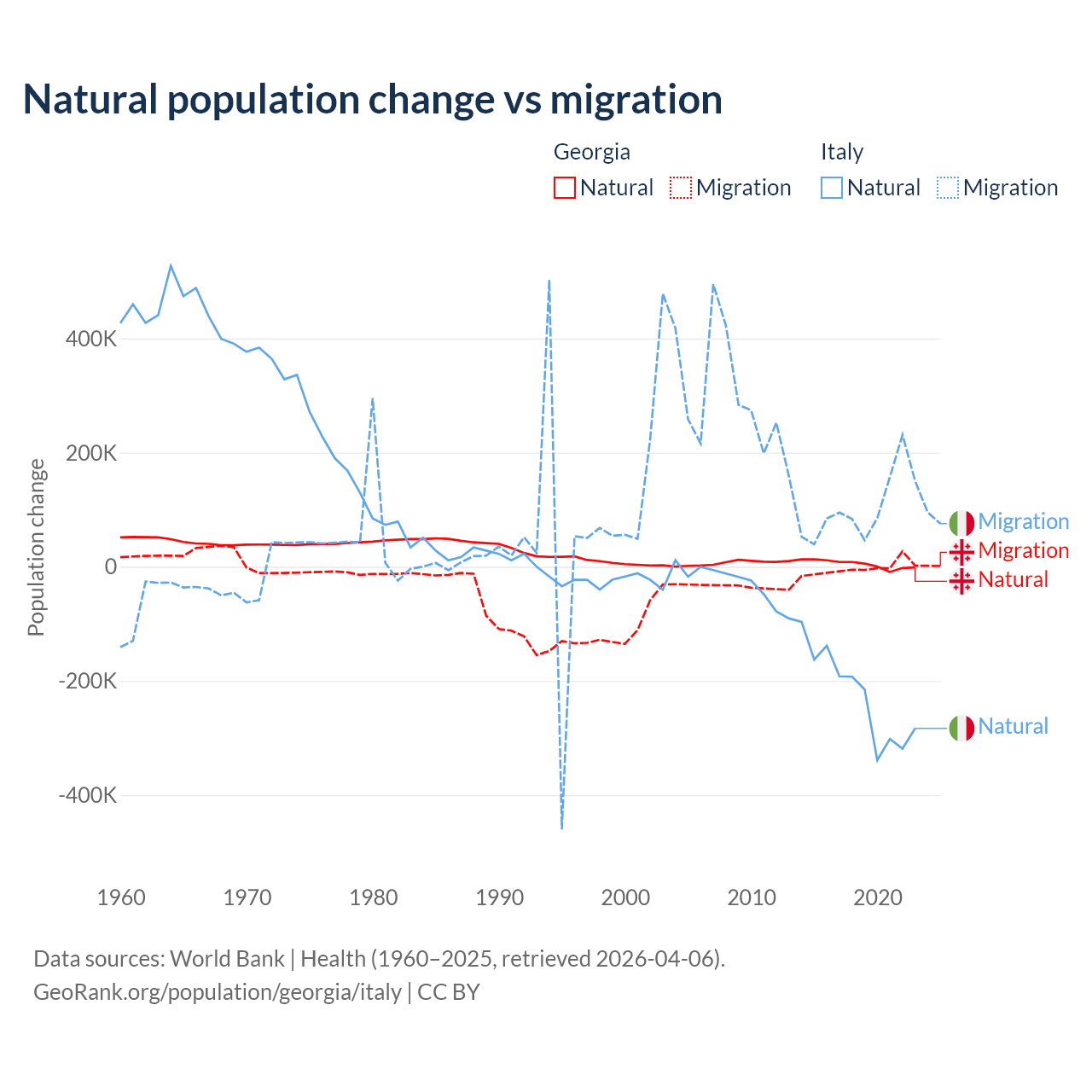 Over the last 10 years, 57.7% of the population change in Georgia is from natural causes (a gain of 47,646 people) and 42.3% is from migration (a loss of 34,907 people). In Italy 68.6% is from natural causes (a loss of 2,239,084 people) and 31.4% is from migration (a gain of 1,026,128 people).
