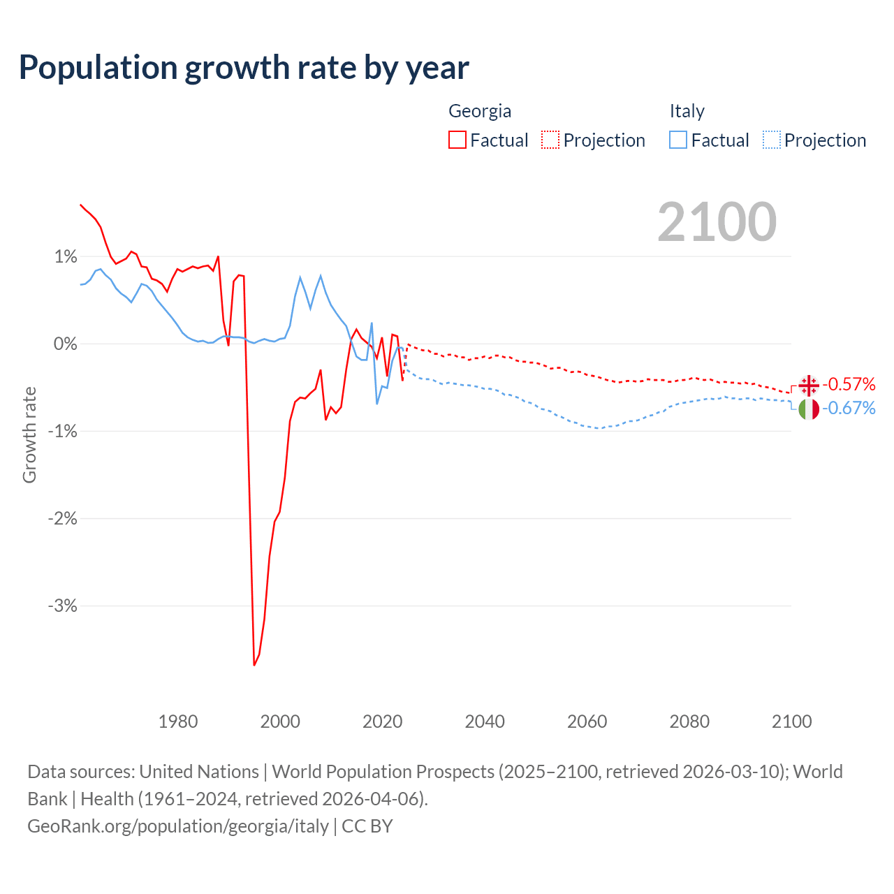 - For the last 10 years, Georgia has had an average growth rate of -0.04% per year vs -0.21% in Italy.