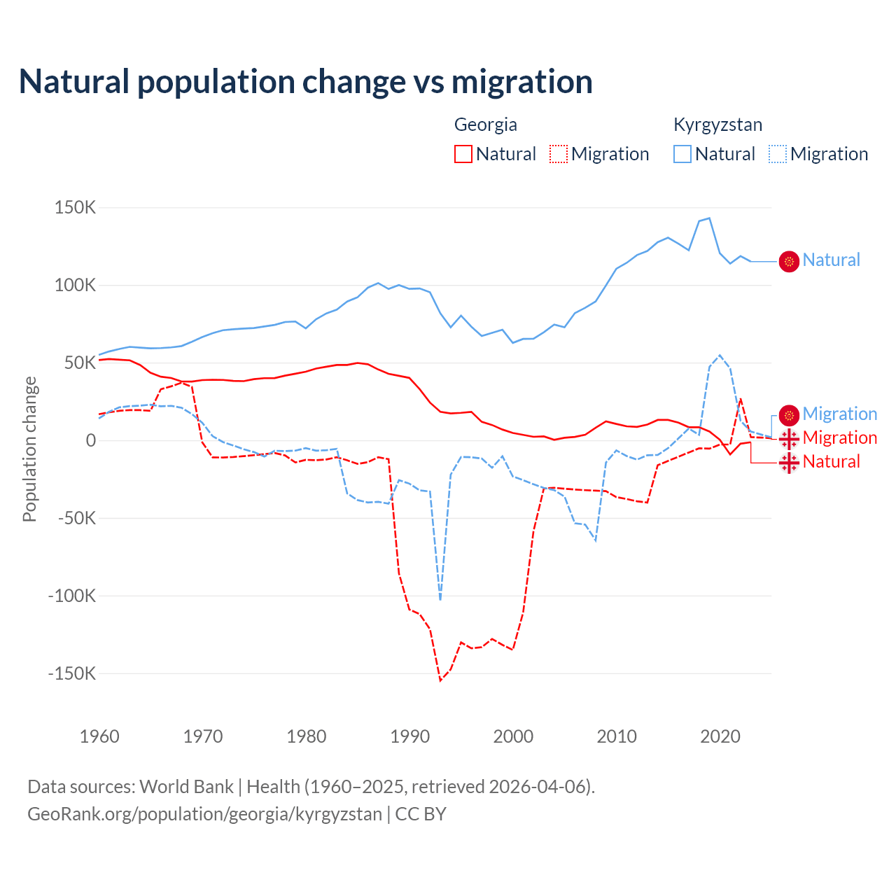 Over the last 10 years, 57.7% of the population change in Georgia is from natural causes (a gain of 47,646 people) and 42.3% is from migration (a loss of 34,907 people). In Kyrgyzstan 88.5% is from natural causes (a gain of 1,258,837 people) and 11.5% is from migration (a gain of 164,132 people).