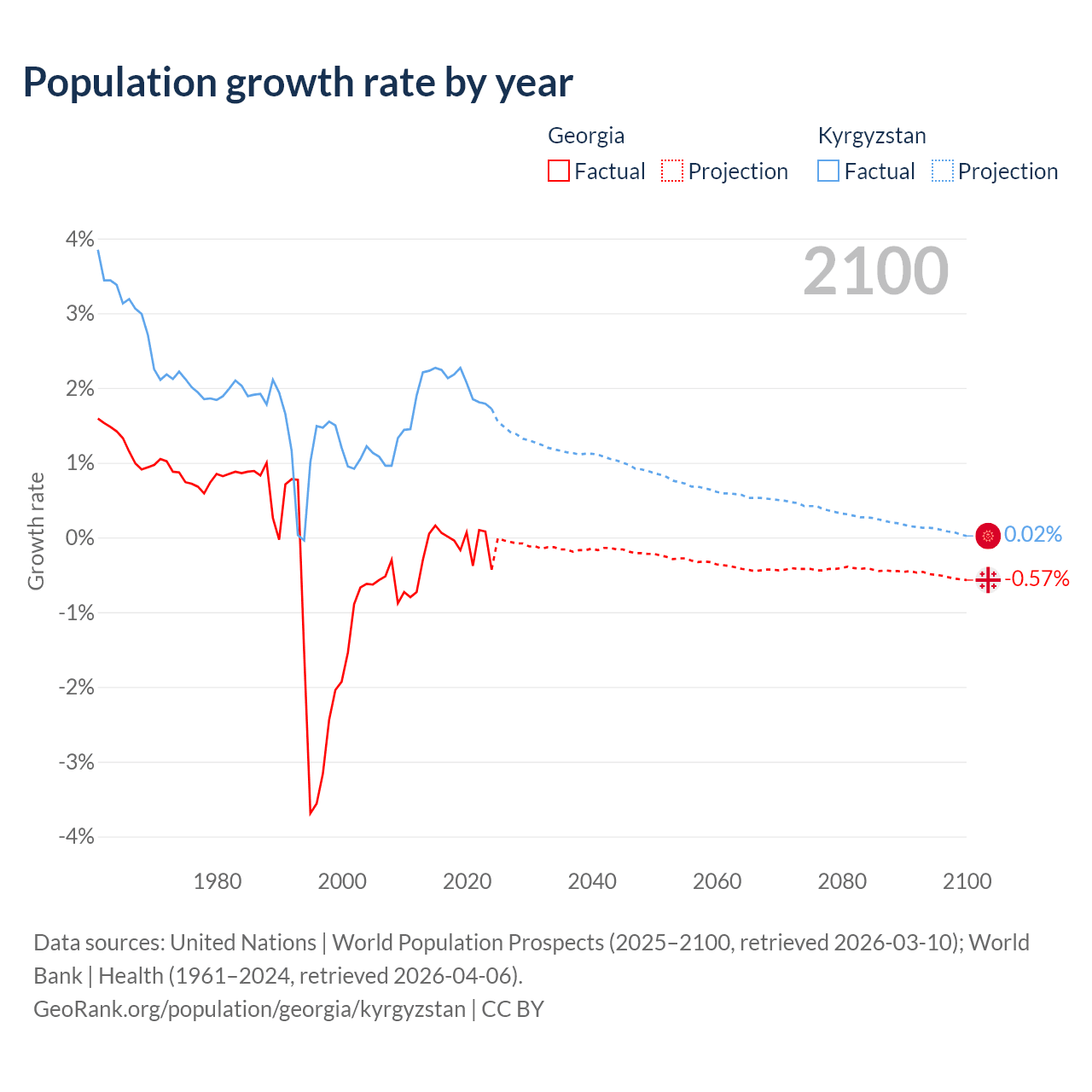 - For the last 10 years, Georgia has had an average growth rate of -0.04% per year vs +2.05% in Kyrgyzstan.
