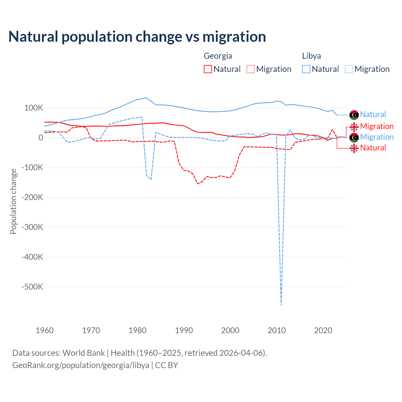 Over the last 10 years, 57.7% of the population change in Georgia is from natural causes (a gain of 47,646 people) and 42.3% is from migration (a loss of 34,907 people). In Libya 99.4% is from natural causes (a gain of 975,799 people) and 0.63% is from migration (a loss of 6,150 people).
