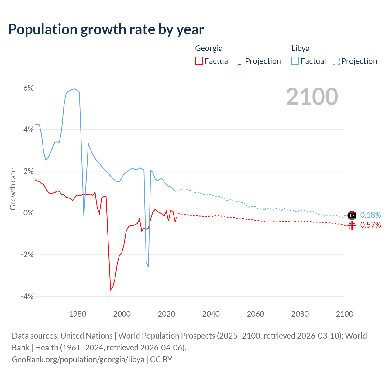- For the last 10 years, Georgia has had an average growth rate of -0.04% per year vs +1.44% in Libya.