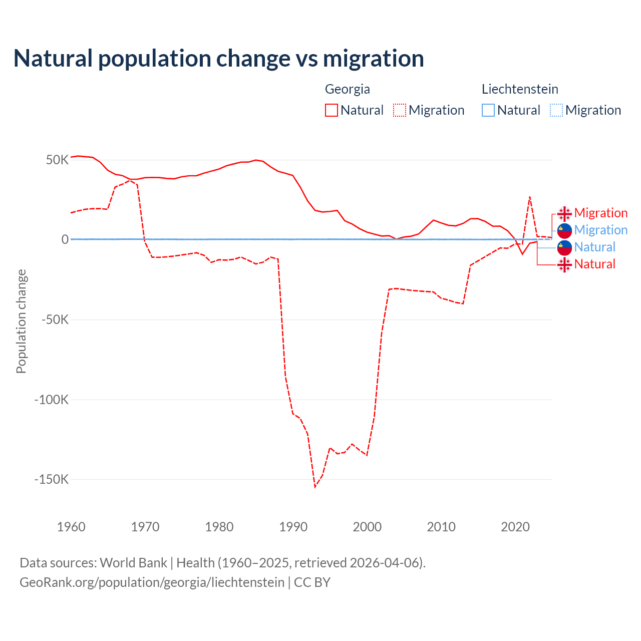 Over the last 10 years, 57.7% of the population change in Georgia is from natural causes (a gain of 47,646 people) and 42.3% is from migration (a loss of 34,907 people). In Liechtenstein 32.4% is from natural causes (a gain of 883 people) and 67.6% is from migration (a gain of 1,843 people).
