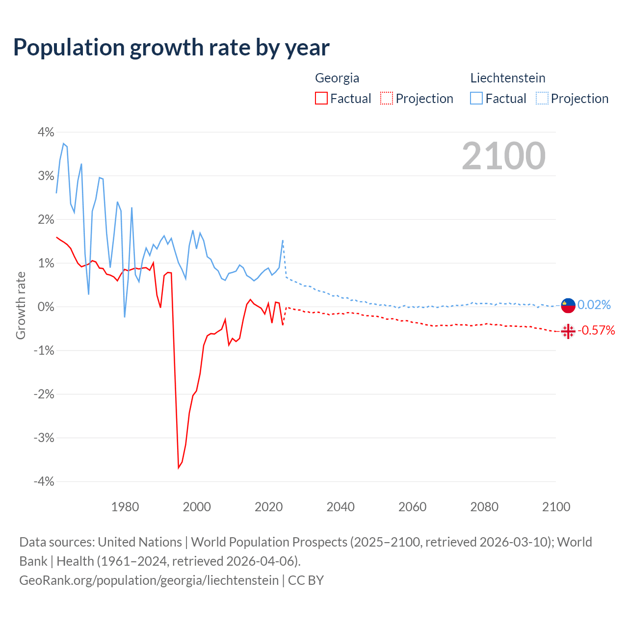 - For the last 10 years, Georgia has had an average growth rate of -0.04% per year vs +0.82% in Liechtenstein.