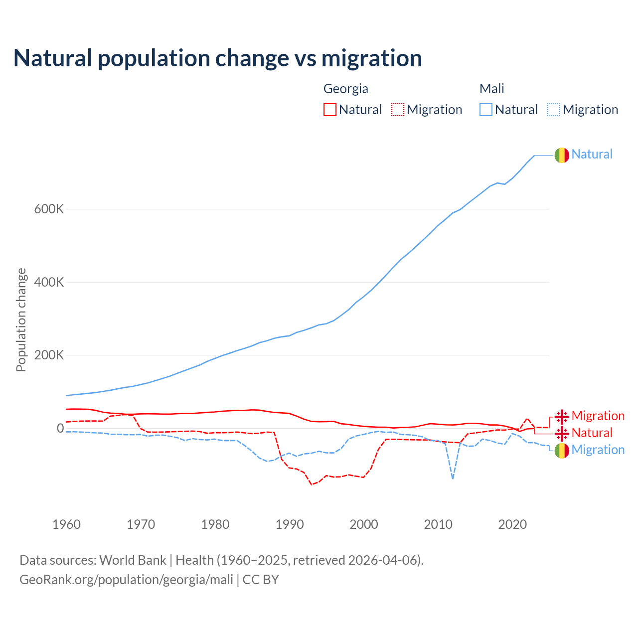 Over the last 10 years, 57.7% of the population change in Georgia is from natural causes (a gain of 47,646 people) and 42.3% is from migration (a loss of 34,907 people). In Mali 94.9% is from natural causes (a gain of 6,749,473 people) and 5.13% is from migration (a loss of 365,292 people).