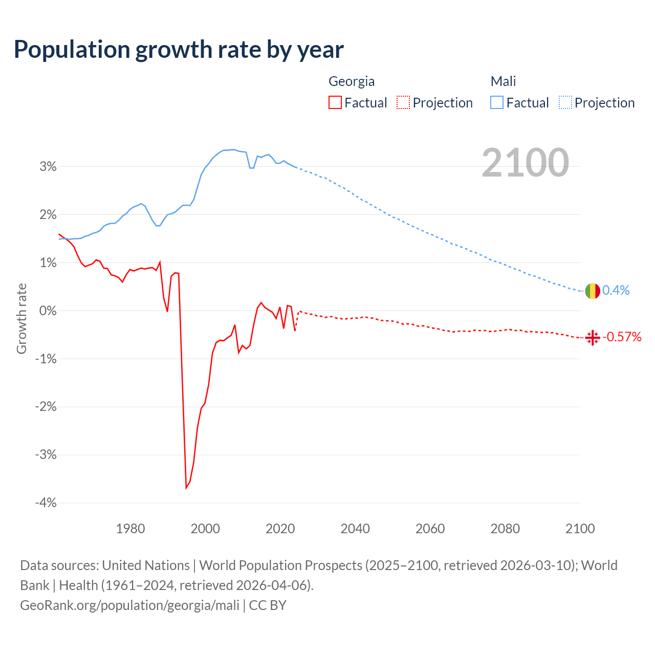 - For the last 10 years, Georgia has had an average growth rate of -0.04% per year vs +3.12% in Mali.