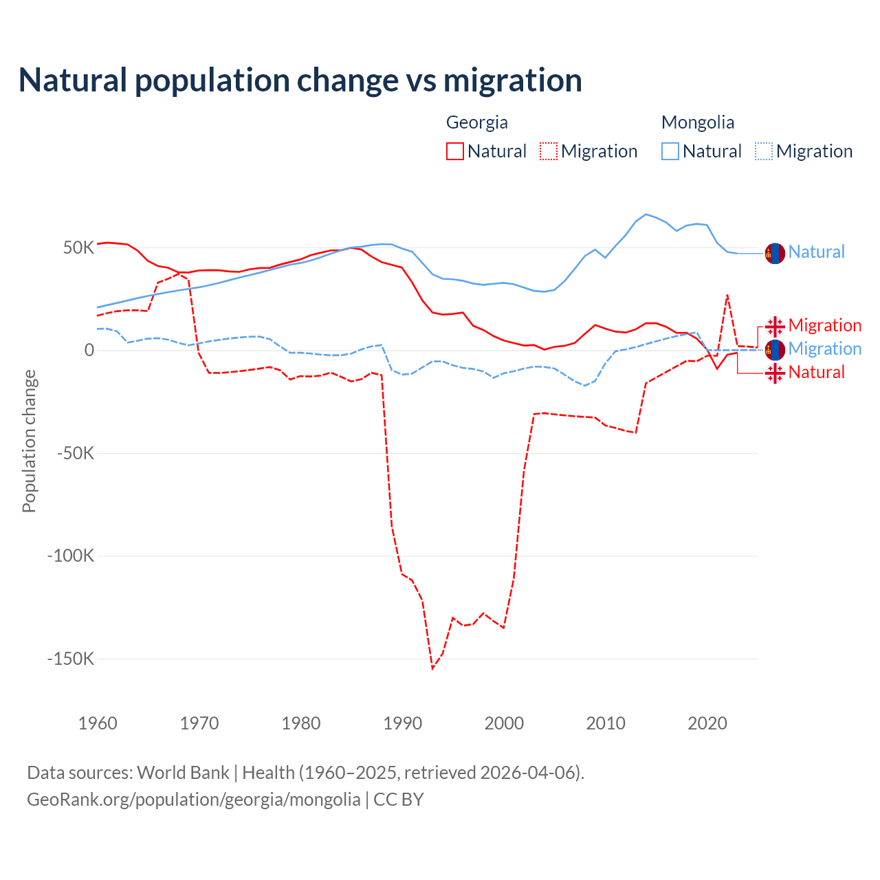 Over the last 10 years, 57.7% of the population change in Georgia is from natural causes (a gain of 47,646 people) and 42.3% is from migration (a loss of 34,907 people). In Mongolia 94.1% is from natural causes (a gain of 580,367 people) and 5.87% is from migration (a gain of 36,163 people).