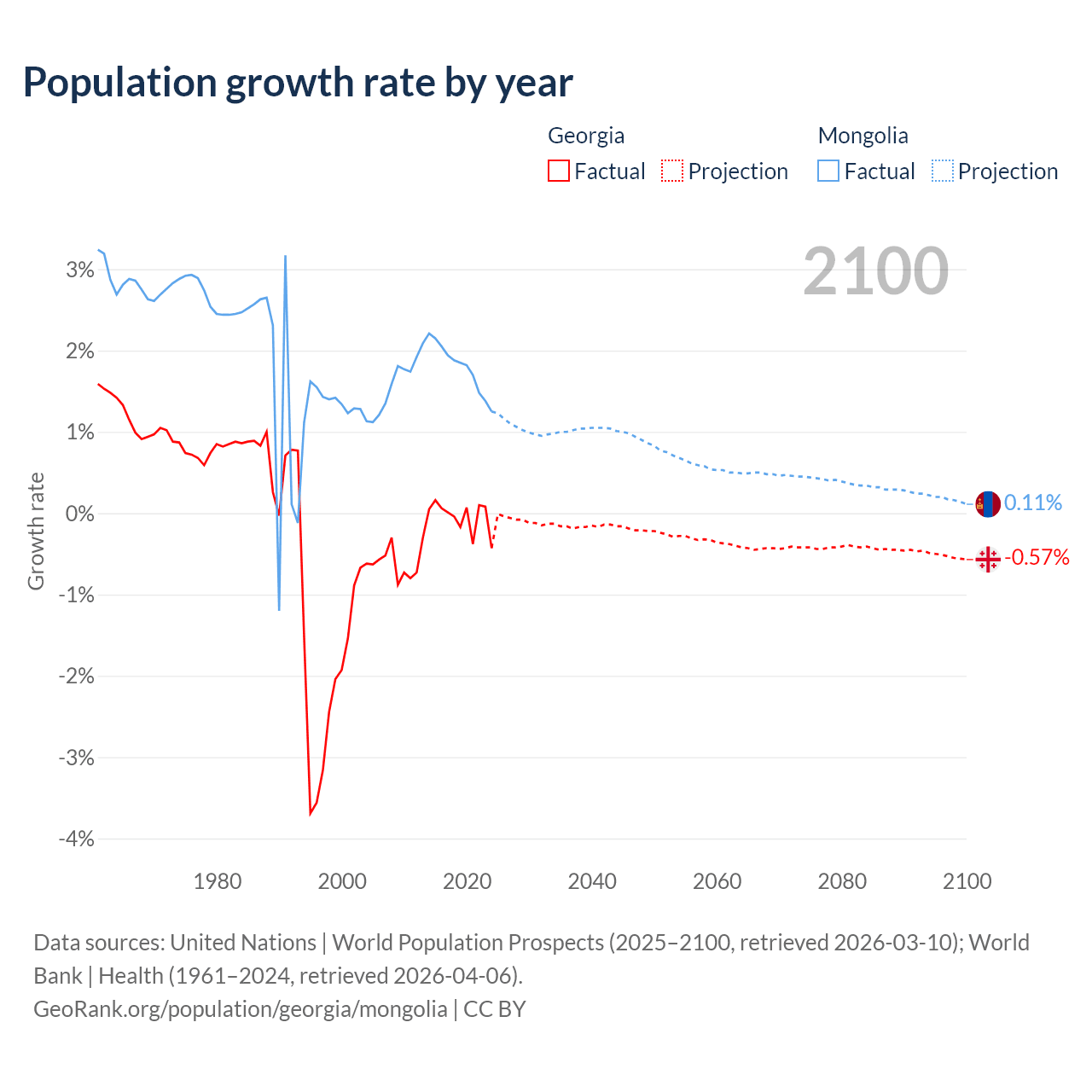 - For the last 10 years, Georgia has had an average growth rate of -0.04% per year vs +1.79% in Mongolia.