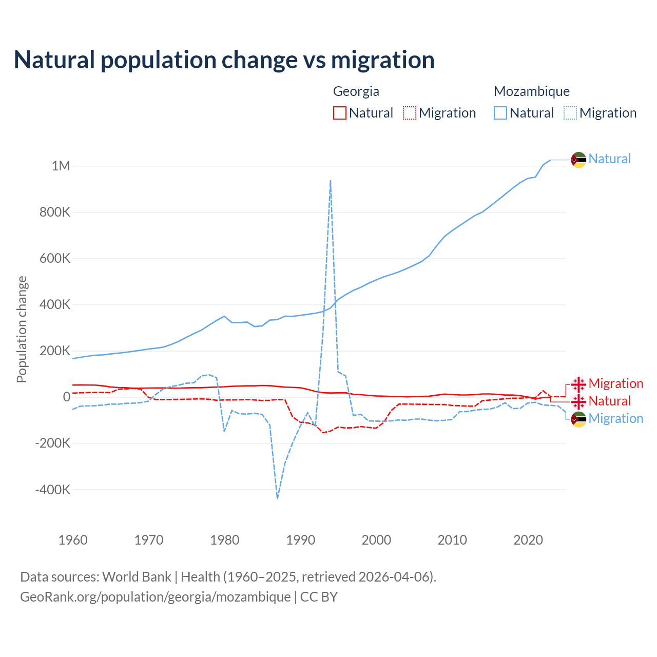Over the last 10 years, 57.7% of the population change in Georgia is from natural causes (a gain of 47,646 people) and 42.3% is from migration (a loss of 34,907 people). In Mozambique 95.9% is from natural causes (a gain of 9,108,203 people) and 4.15% is from migration (a loss of 393,923 people).