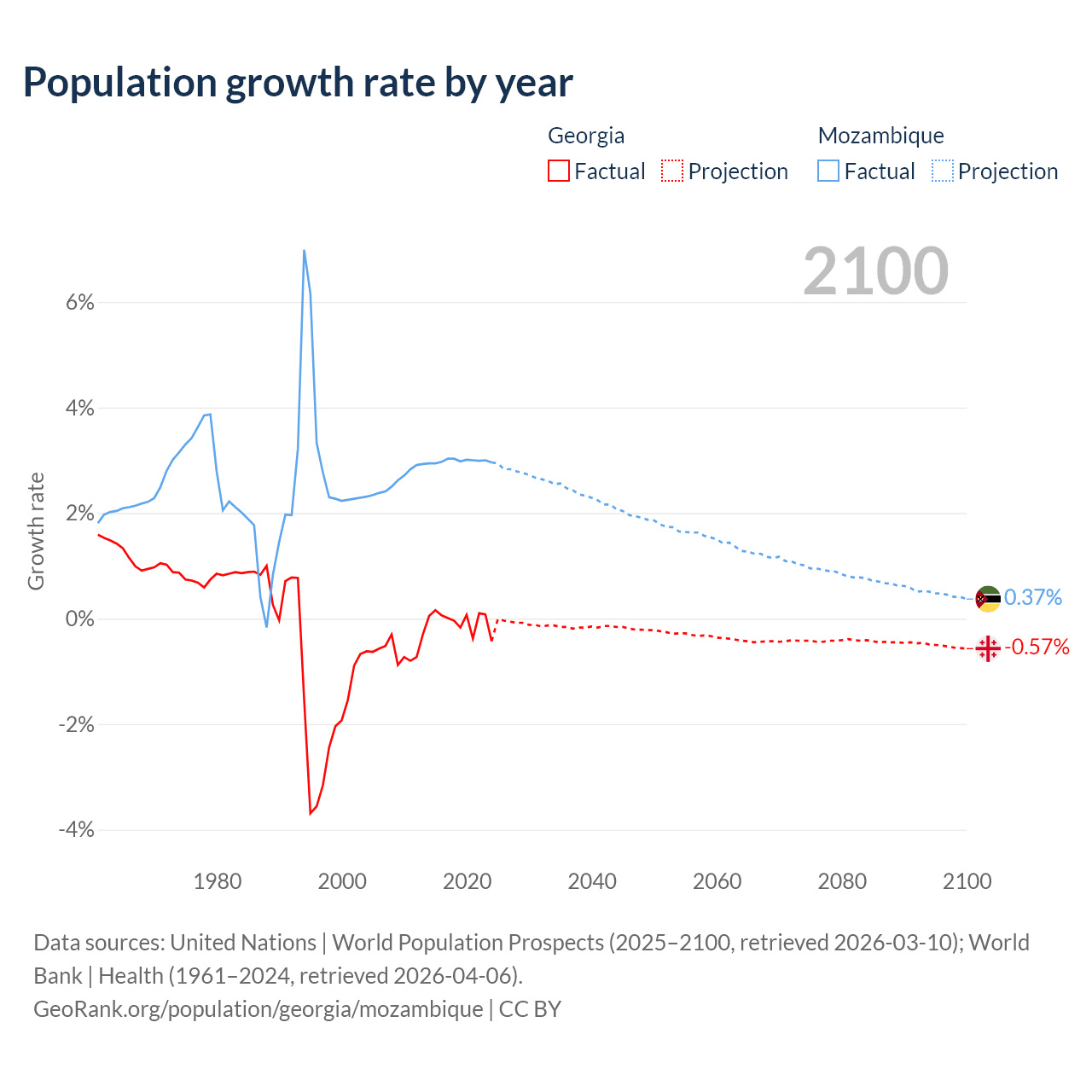 - For the last 10 years, Georgia has had an average growth rate of -0.04% per year vs +2.99% in Mozambique.