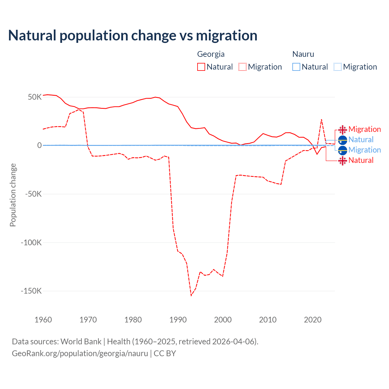 Over the last 10 years, 57.7% of the population change in Georgia is from natural causes (a gain of 47,646 people) and 42.3% is from migration (a loss of 34,907 people). In Nauru 66.2% is from natural causes (a gain of 2,590 people) and 33.8% is from migration (a loss of 1,320 people).