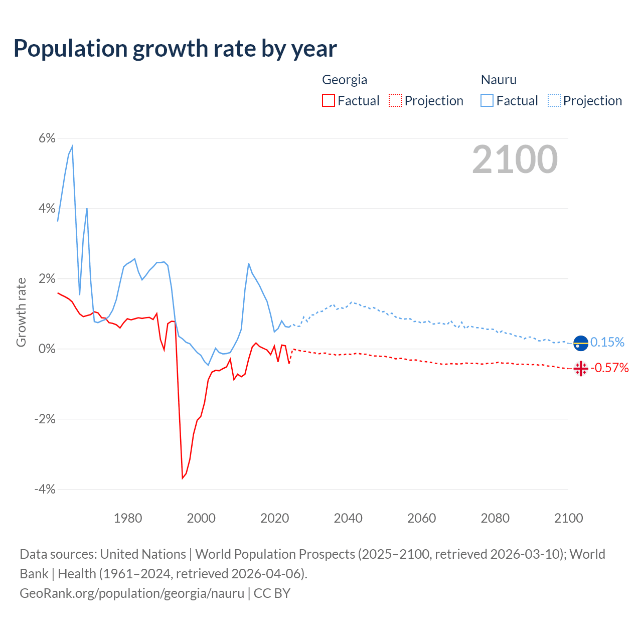 - For the last 10 years, Georgia has had an average growth rate of -0.04% per year vs +1.17% in Nauru.