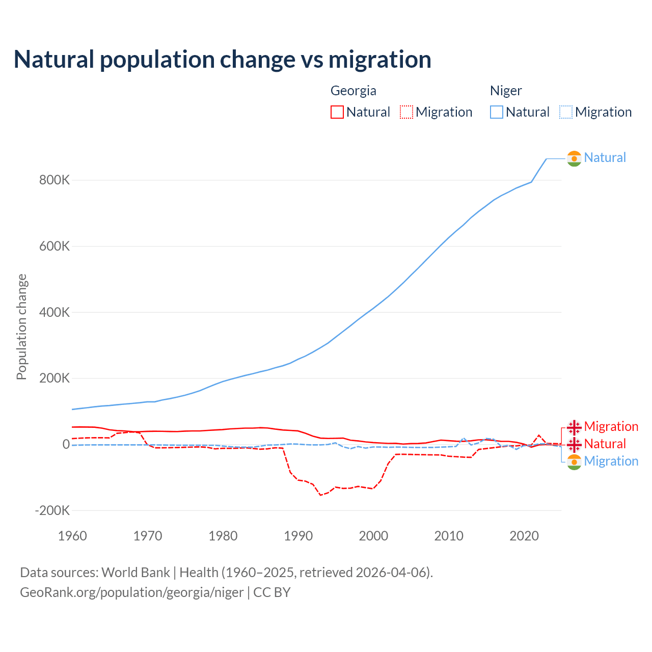 Over the last 10 years, 57.7% of the population change in Georgia is from natural causes (a gain of 47,646 people) and 42.3% is from migration (a loss of 34,907 people). In Niger 100% is from natural causes (a gain of 7,728,287 people) and 0.03% is from migration (a gain of 2,520 people).