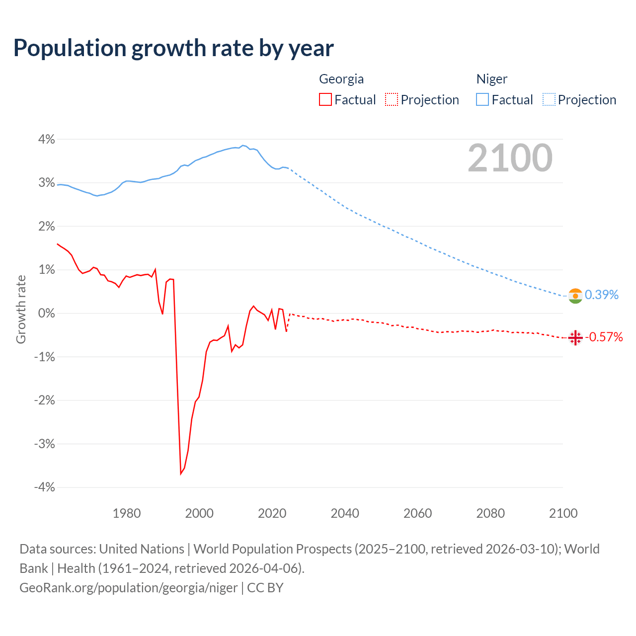 - For the last 10 years, Georgia has had an average growth rate of -0.04% per year vs +3.5% in Niger.