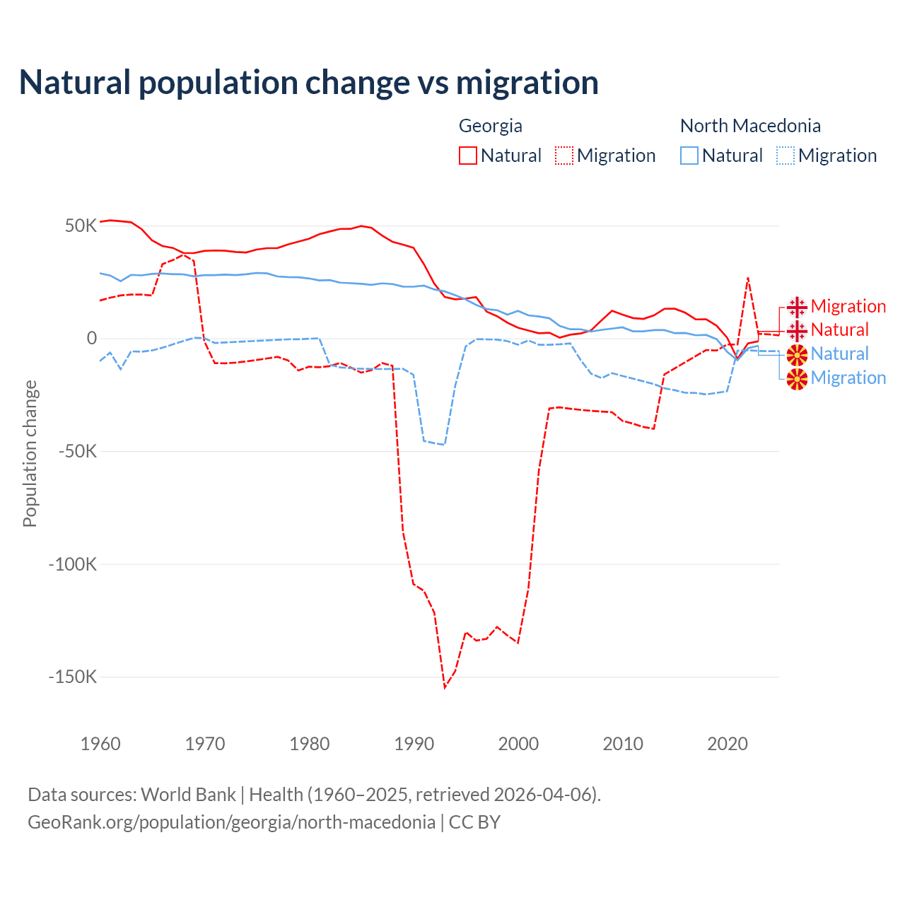 Over the last 10 years, 57.7% of the population change in Georgia is from natural causes (a gain of 47,646 people) and 42.3% is from migration (a loss of 34,907 people). In North Macedonia 6.45% is from natural causes (a loss of 12,585 people) and 93.5% is from migration (a loss of 182,429 people).