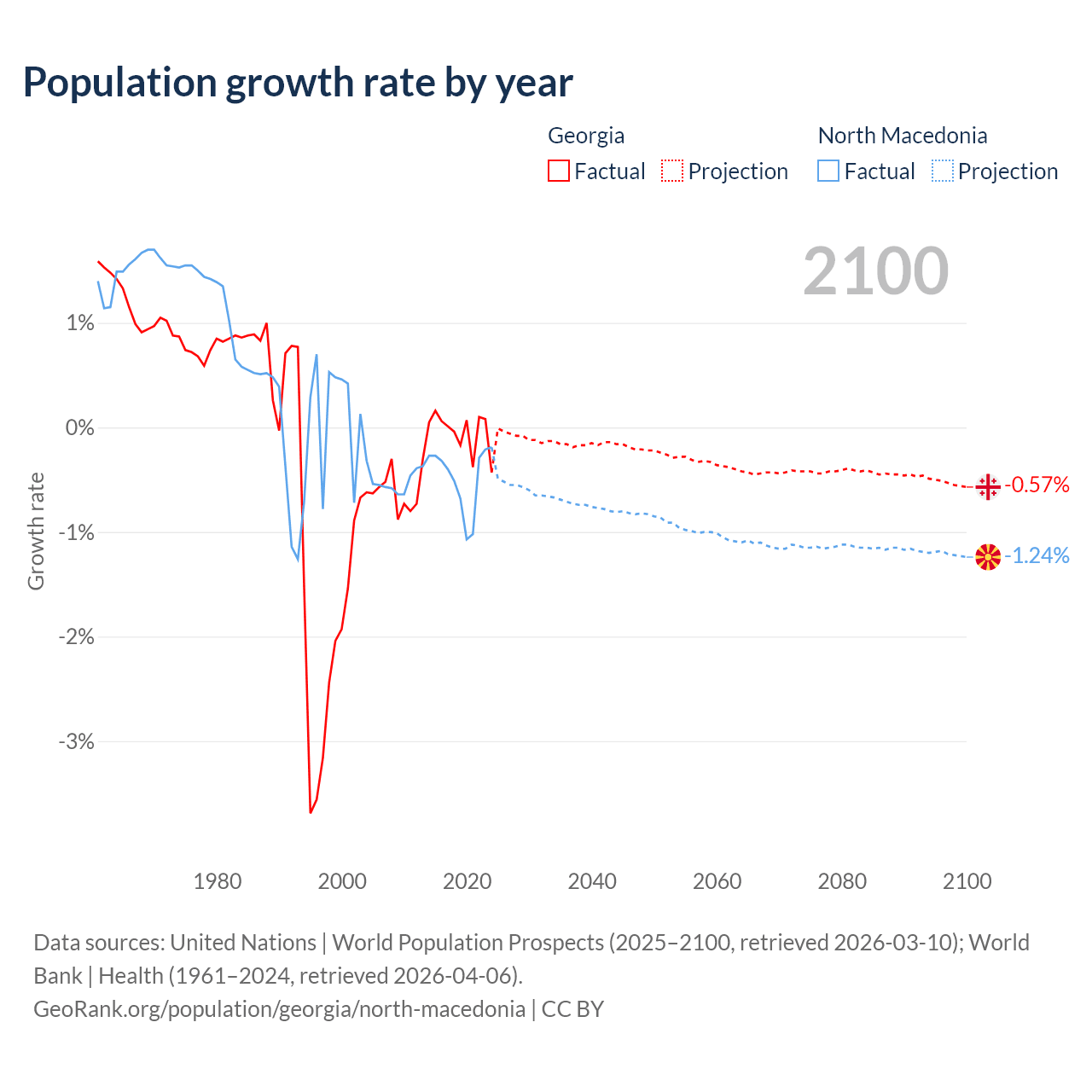 - For the last 10 years, Georgia has had an average growth rate of -0.04% per year vs -0.48% in North Macedonia.