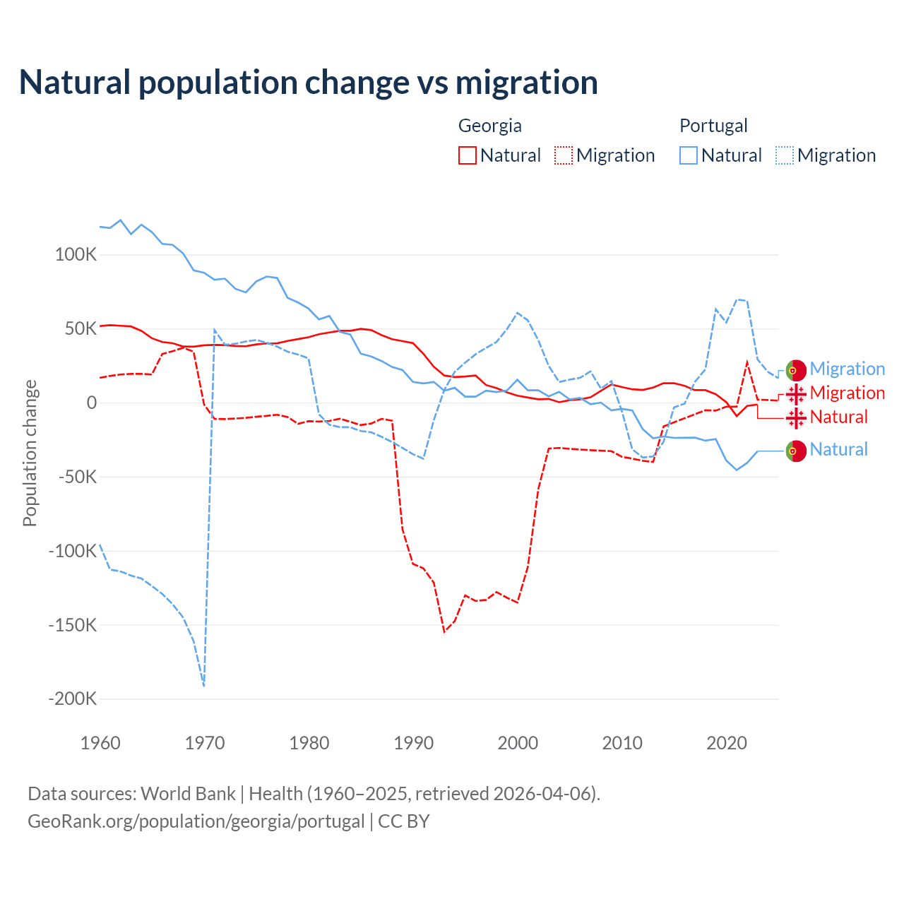 Over the last 10 years, 57.7% of the population change in Georgia is from natural causes (a gain of 47,646 people) and 42.3% is from migration (a loss of 34,907 people). In Portugal 51% is from natural causes (a loss of 302,748 people) and 49% is from migration (a gain of 290,554 people).