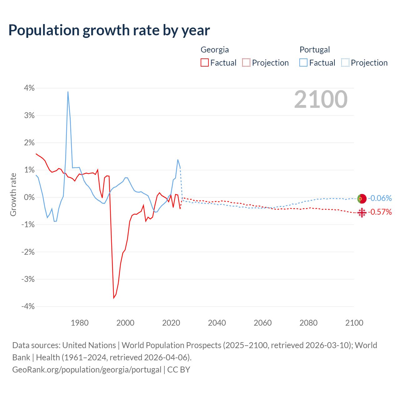 - For the last 10 years, Georgia has had an average growth rate of -0.04% per year vs +0.21% in Portugal.