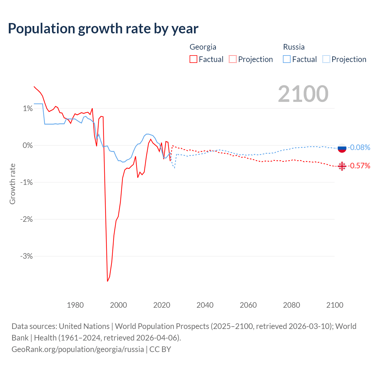 - For the last 10 years, Georgia has had an average growth rate of -0.04% per year vs -0.02% in Russia.