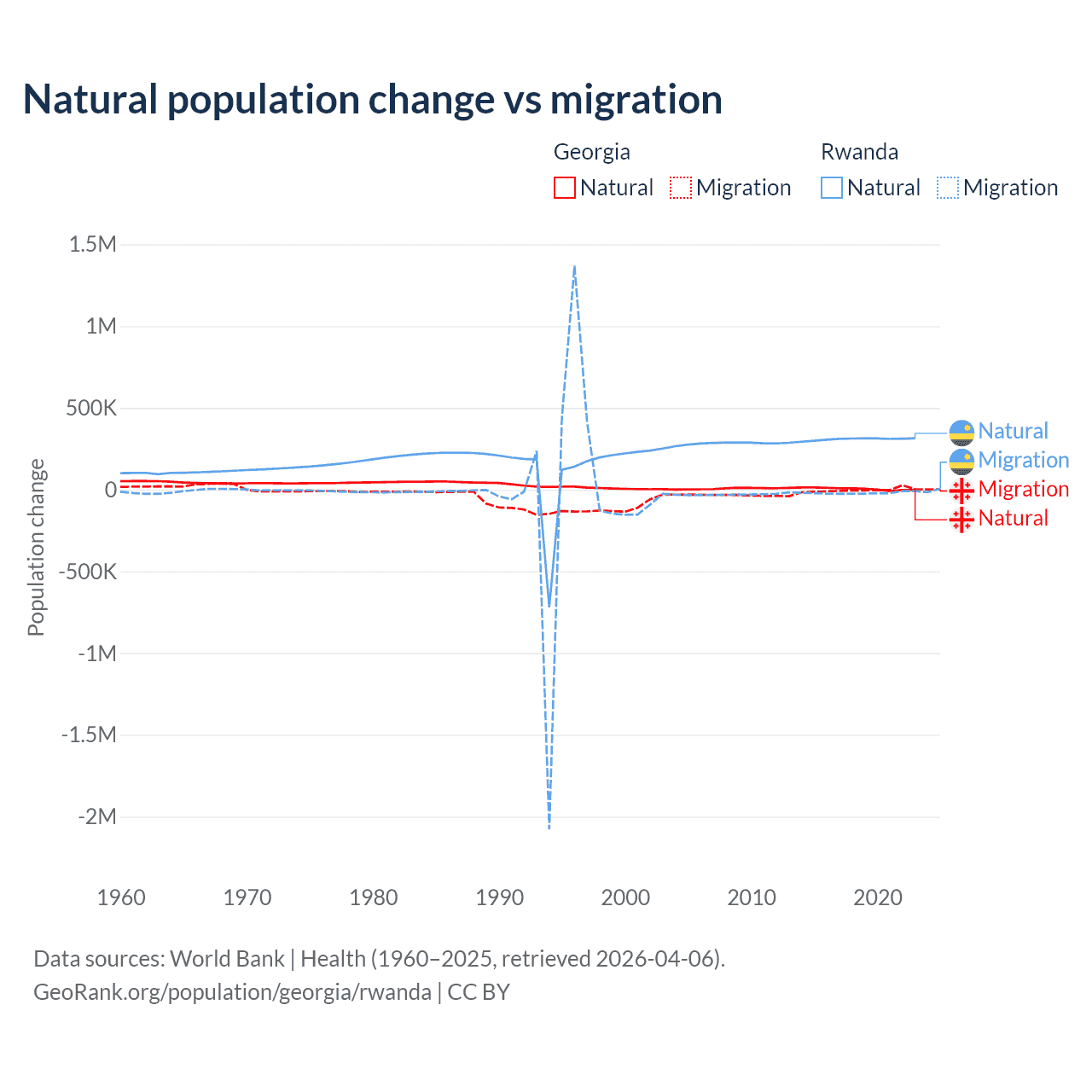 Over the last 10 years, 57.7% of the population change in Georgia is from natural causes (a gain of 47,646 people) and 42.3% is from migration (a loss of 34,907 people). In Rwanda 93.8% is from natural causes (a gain of 3,081,296 people) and 6.18% is from migration (a loss of 203,035 people).