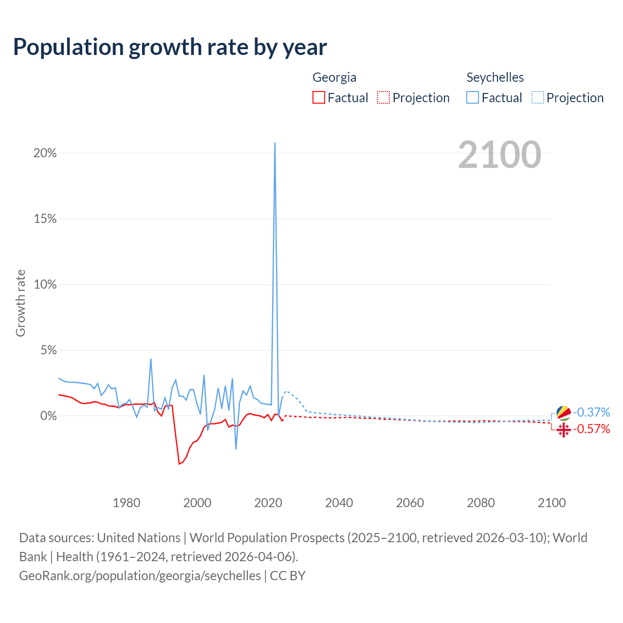 - For the last 10 years, Georgia has had an average growth rate of -0.04% per year vs +2.9% in the Seychelles.