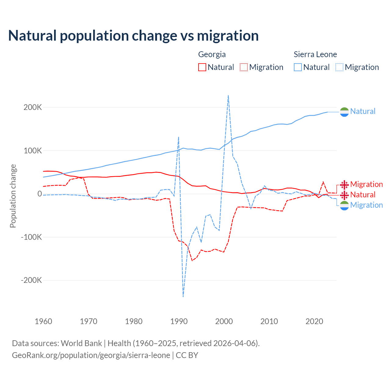 Over the last 10 years, 57.7% of the population change in Georgia is from natural causes (a gain of 47,646 people) and 42.3% is from migration (a loss of 34,907 people). In Sierra Leone 99.6% is from natural causes (a gain of 1,764,049 people) and 0.41% is from migration (a loss of 7,211 people).