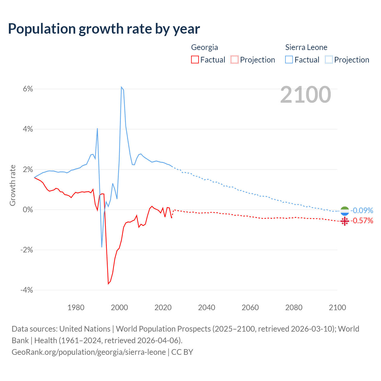 - For the last 10 years, Georgia has had an average growth rate of -0.04% per year vs +2.32% in Sierra Leone.