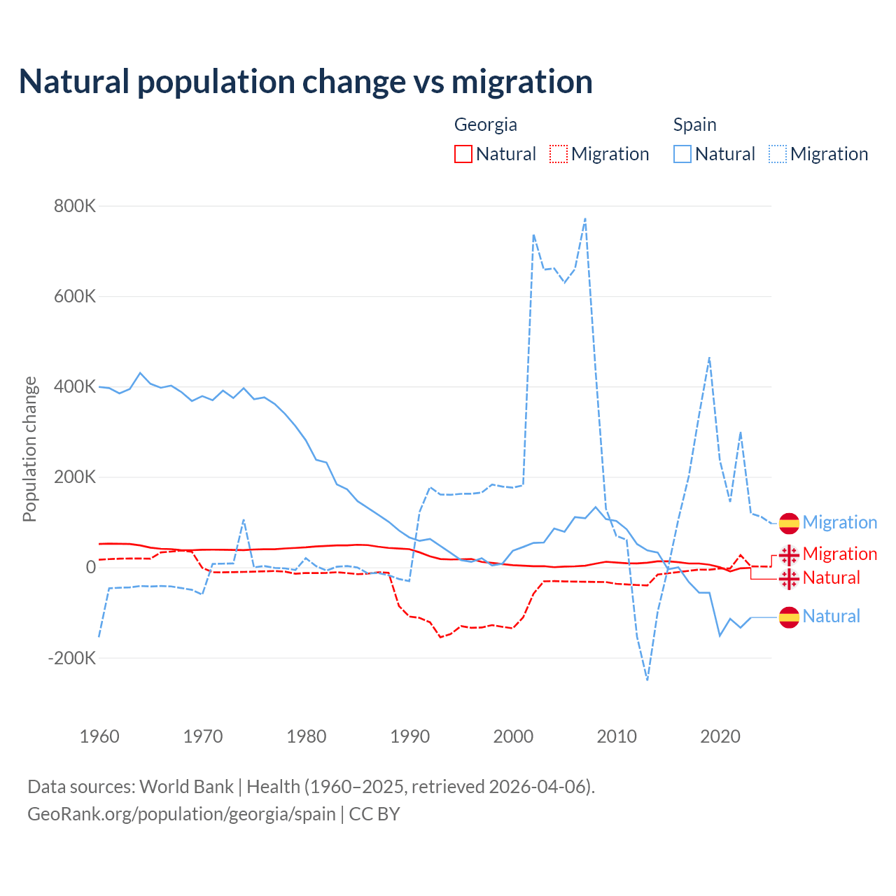 Over the last 10 years, 57.7% of the population change in Georgia is from natural causes (a gain of 47,646 people) and 42.3% is from migration (a loss of 34,907 people). In Spain 25.8% is from natural causes (a loss of 627,829 people) and 74.2% is from migration (a gain of 1,810,127 people).