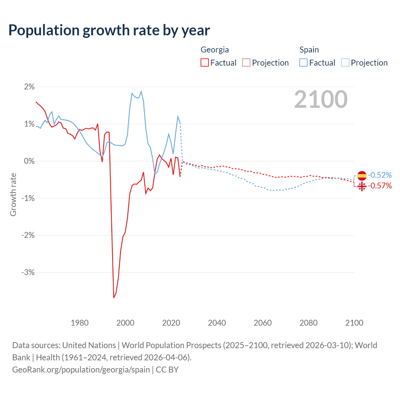- For the last 10 years, Georgia has had an average growth rate of -0.04% per year vs +0.43% in Spain.