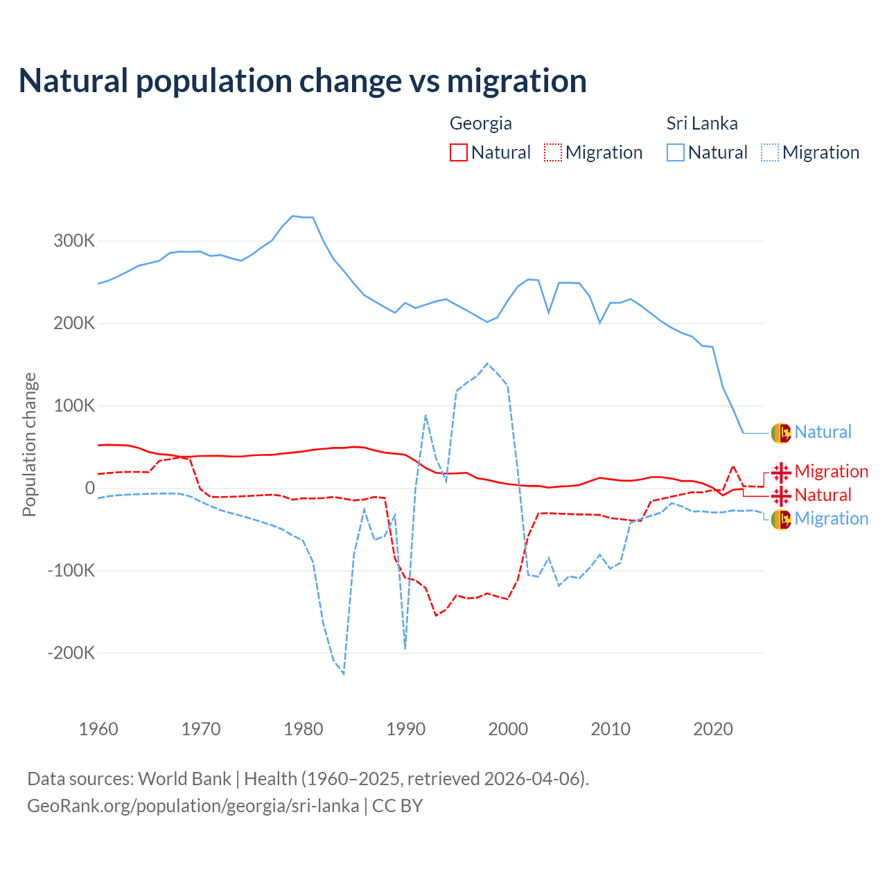 Over the last 10 years, 57.7% of the population change in Georgia is from natural causes (a gain of 47,646 people) and 42.3% is from migration (a loss of 34,907 people). In Sri Lanka 85.3% is from natural causes (a gain of 1,605,749 people) and 14.7% is from migration (a loss of 276,121 people).