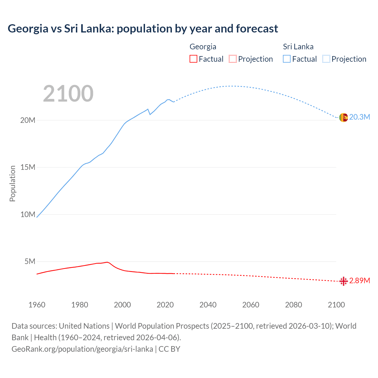 The latest officially reported population of Georgia was 3,699,557 in 2024 vs 21,916,000 people in Sri Lanka in 2024. In 2026, based on the adjusted UN estimation, the current Georgia's population is 3,697,615 people compared to 22,185,425 in Sri Lanka.