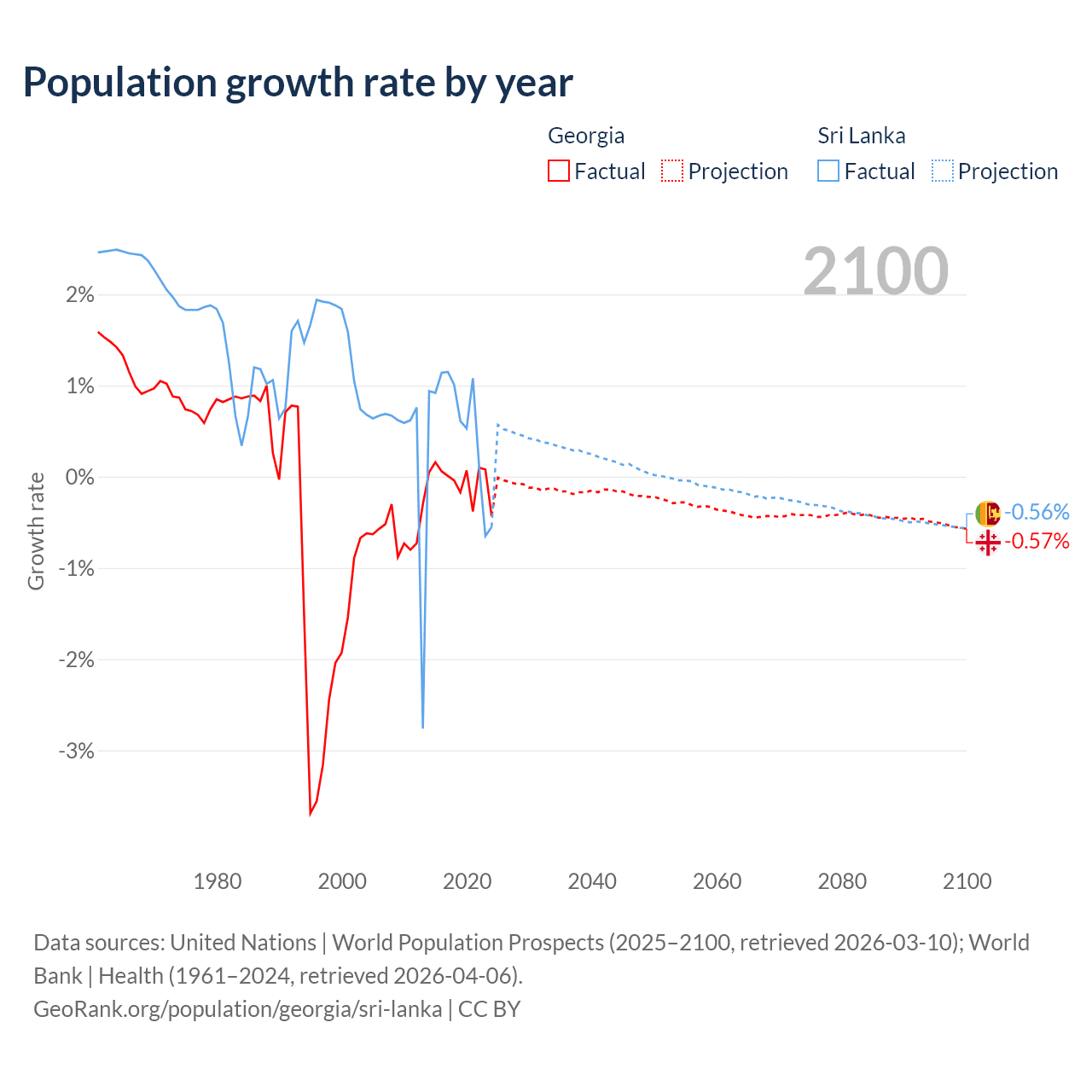 - For the last 10 years, Georgia has had an average growth rate of -0.04% per year vs +0.57% in Sri Lanka.