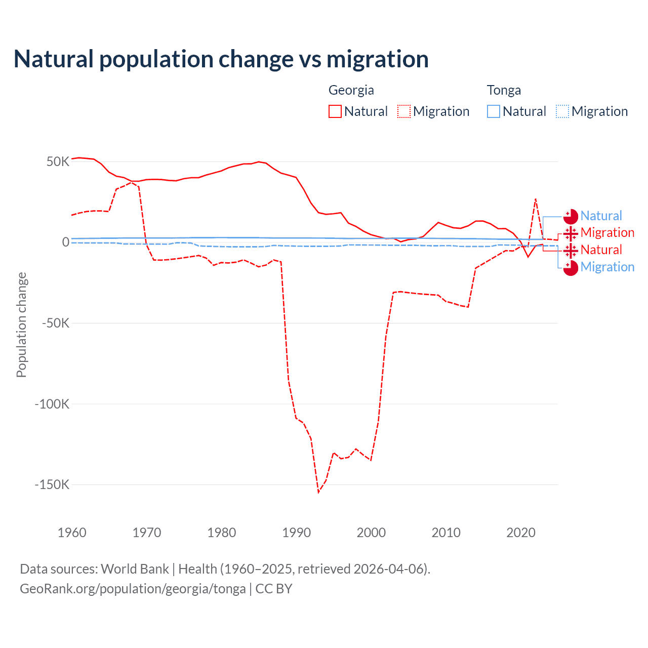 Over the last 10 years, 57.7% of the population change in Georgia is from natural causes (a gain of 47,646 people) and 42.3% is from migration (a loss of 34,907 people). In Tonga 46.9% is from natural causes (a gain of 18,919 people) and 53.1% is from migration (a loss of 21,384 people).