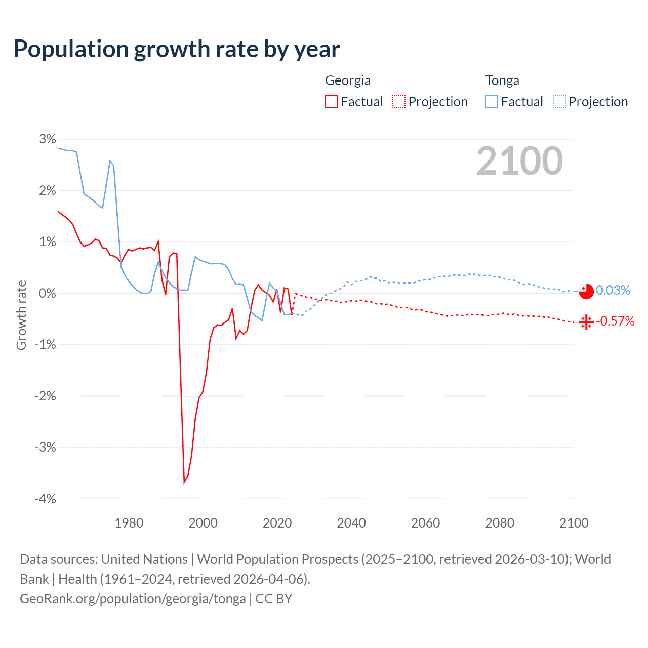 - For the last 10 years, Georgia has had an average growth rate of -0.04% per year vs -0.25% in Tonga.