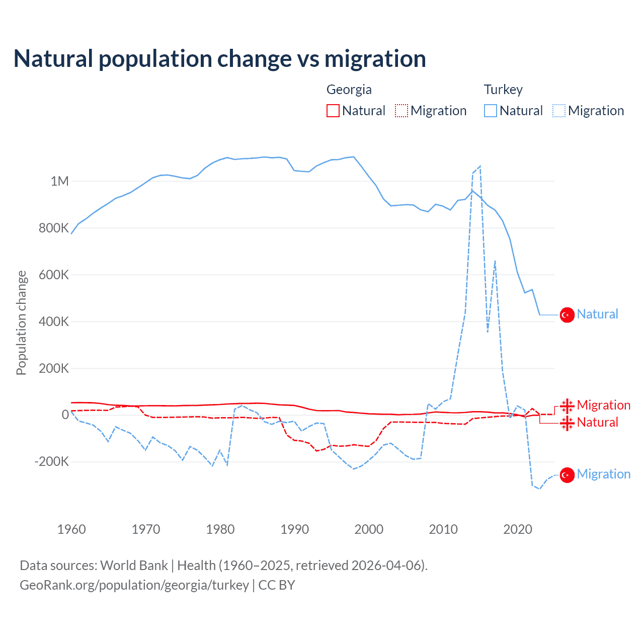 Over the last 10 years, 57.7% of the population change in Georgia is from natural causes (a gain of 47,646 people) and 42.3% is from migration (a loss of 34,907 people). In Turkey 73% is from natural causes (a gain of 7,333,352 people) and 27% is from migration (a gain of 2,718,916 people).