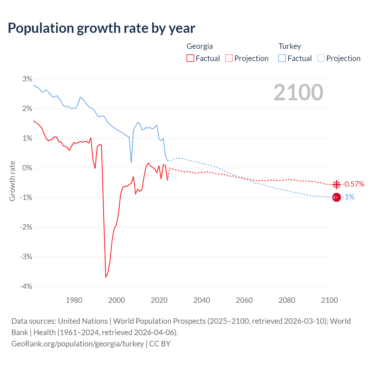 - For the last 10 years, Georgia has had an average growth rate of -0.04% per year vs +1.06% in Turkey.
