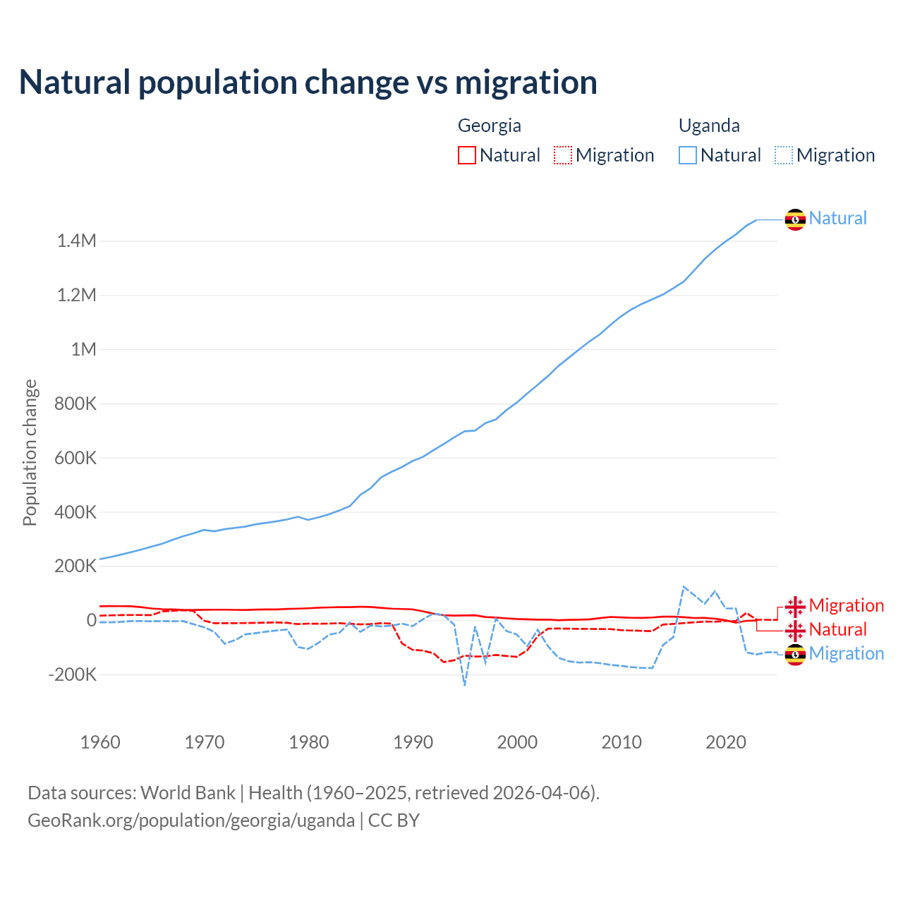 Over the last 10 years, 57.7% of the population change in Georgia is from natural causes (a gain of 47,646 people) and 42.3% is from migration (a loss of 34,907 people). In Uganda 99.5% is from natural causes (a gain of 13,419,712 people) and 0.53% is from migration (a gain of 71,457 people).