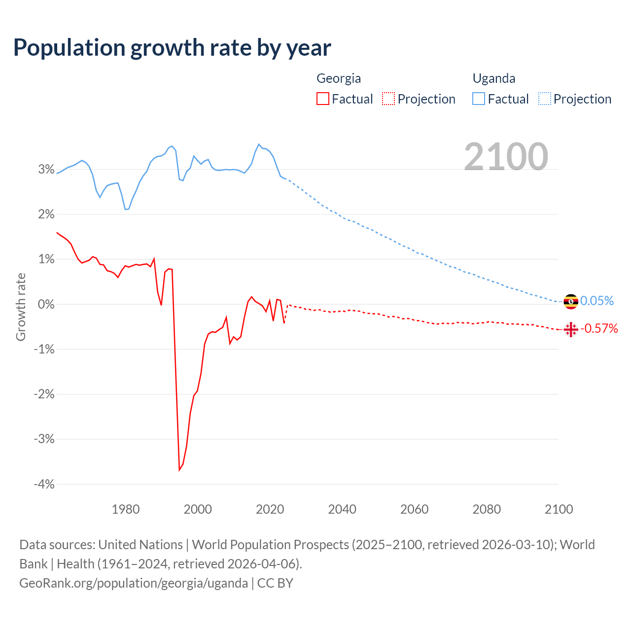 - For the last 10 years, Georgia has had an average growth rate of -0.04% per year vs +3.21% in Uganda.