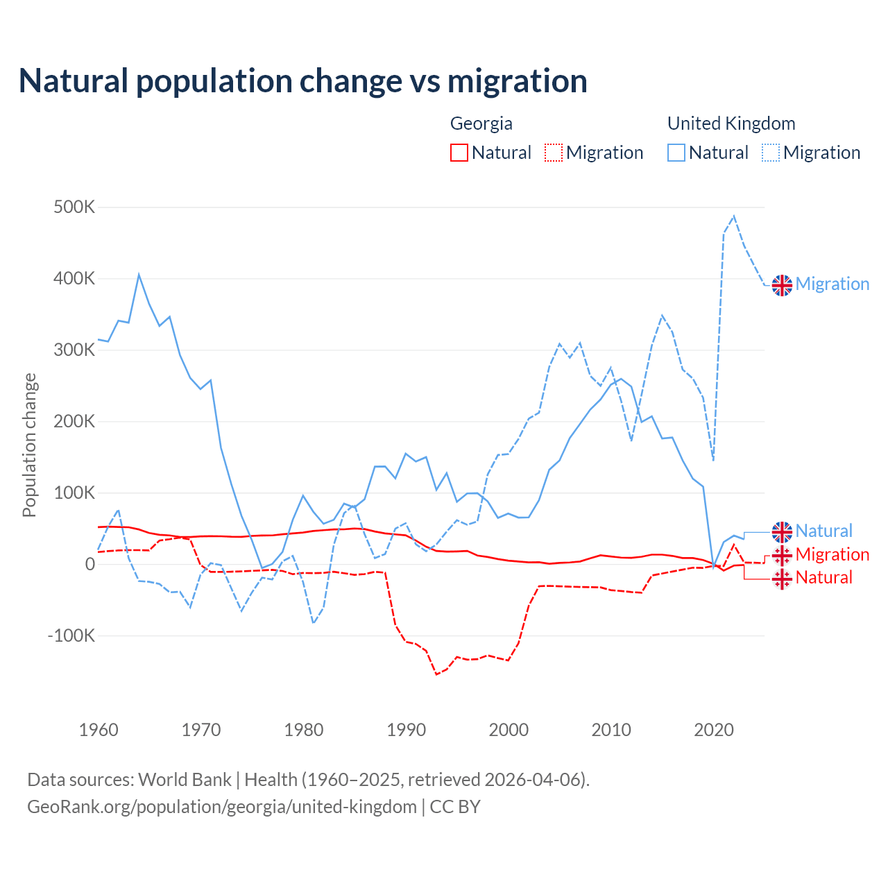 Over the last 10 years, 57.7% of the population change in Georgia is from natural causes (a gain of 47,646 people) and 42.3% is from migration (a loss of 34,907 people). In the United Kingdom 23.9% is from natural causes (a gain of 1,033,129 people) and 76.1% is from migration (a gain of 3,283,101 people).