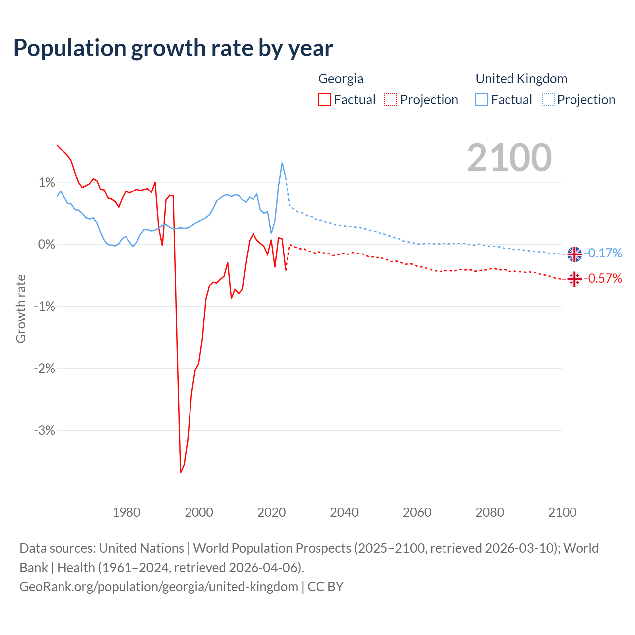 - For the last 10 years, Georgia has had an average growth rate of -0.04% per year vs +0.7% in the United Kingdom.