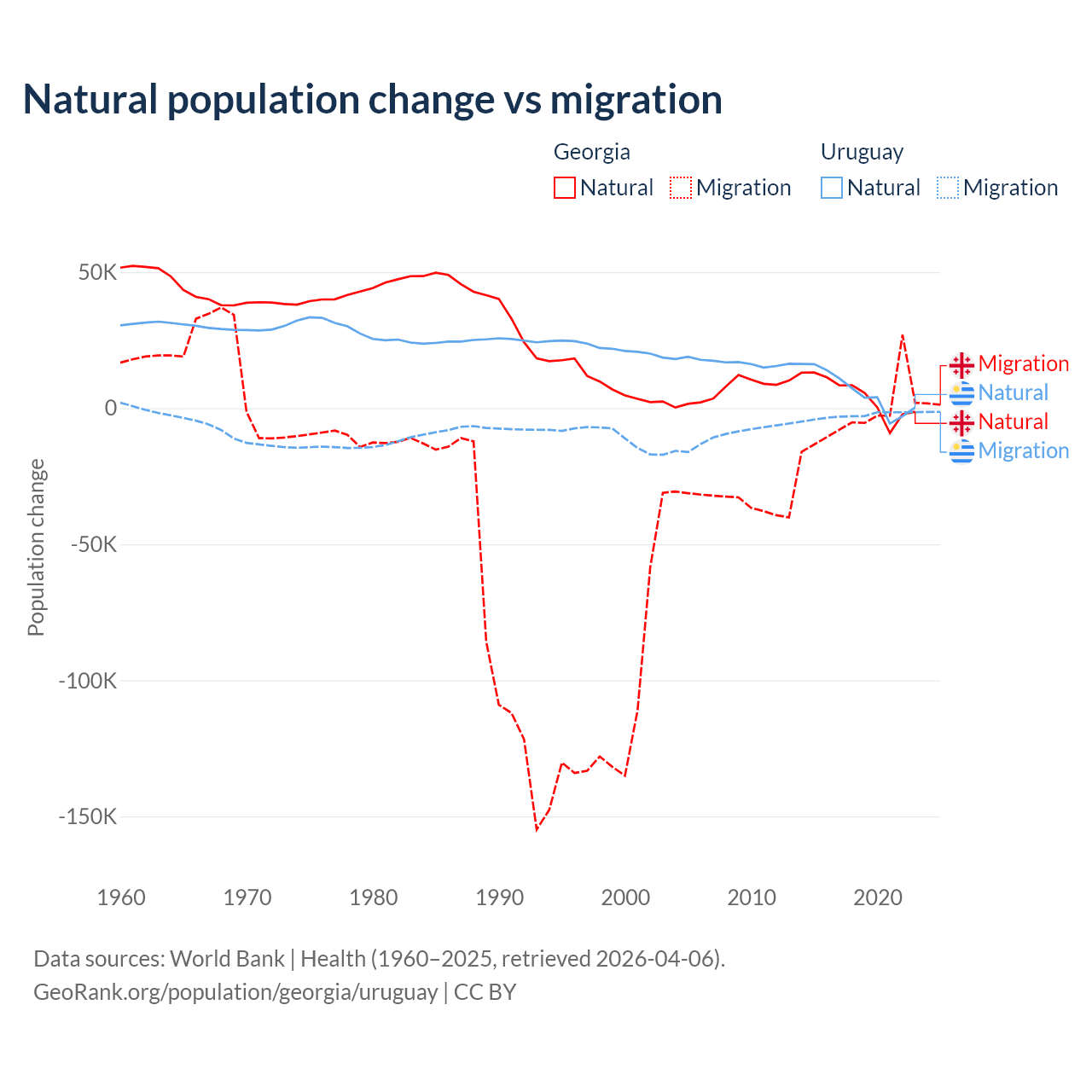 Over the last 10 years, 57.7% of the population change in Georgia is from natural causes (a gain of 47,646 people) and 42.3% is from migration (a loss of 34,907 people). In Uruguay 70% is from natural causes (a gain of 64,303 people) and 30% is from migration (a loss of 27,501 people).