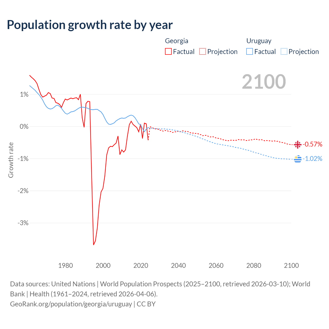 - For the last 10 years, Georgia has had an average growth rate of -0.04% per year vs +0.11% in Uruguay.