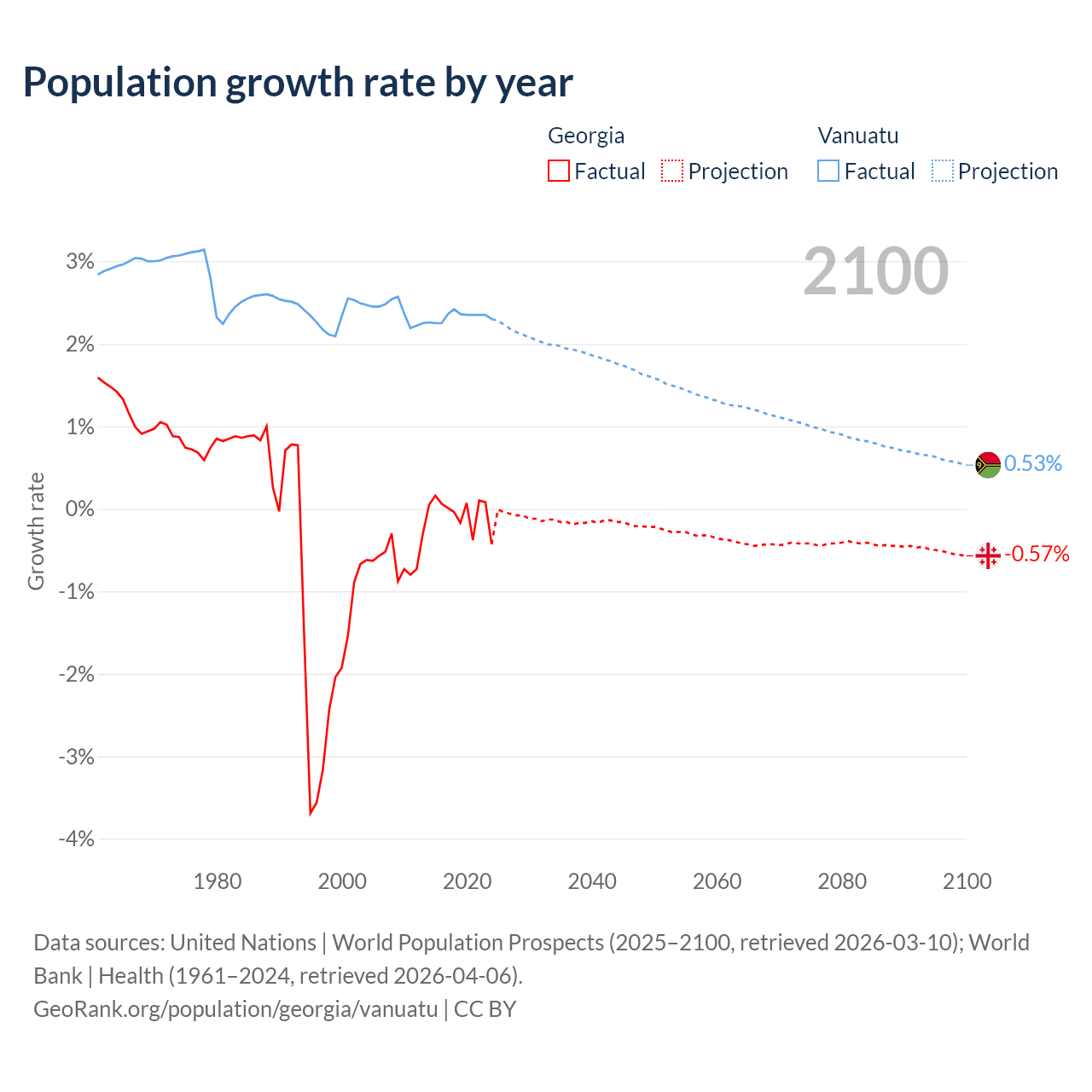 - For the last 10 years, Georgia has had an average growth rate of -0.04% per year vs +2.33% in Vanuatu.