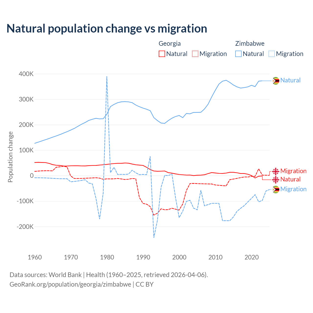Over the last 10 years, 57.7% of the population change in Georgia is from natural causes (a gain of 47,646 people) and 42.3% is from migration (a loss of 34,907 people). In Zimbabwe 74.9% is from natural causes (a gain of 3,558,487 people) and 25.1% is from migration (a loss of 1,192,807 people).